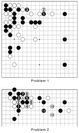 Problem 2: In the same series this situation appeared. Black 1 seems fair enough, but what about white 2? Can't it be cut easily? Or perhaps it is the other way round. If black is being cut, how should he defend against white 2?