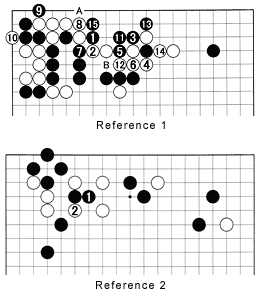 Reference 2: Black 1 seems natural, but that way, in the moves through 9 (Black has to connect his three stones by playing 9 at A), White can now play at 10 and 12, putting pressure on Black's corner on the right. The white stones around 4 and 8 are not weak, and Black has a defect at A that White can aim at.