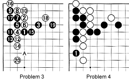Solution 3: Again, everything depends on who moves first. As can be seen in the previous two situations, Black needs to play at 1 and 5 to live. After that, White plays on the upper side to ensure life for his stones in that area. Note: White needs white 20 or A in Problem 3 to be able to play 2 (otherwise he would be cut at 4).