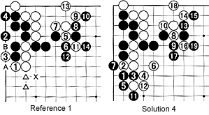 Reference 4: For Black, it is even possible to play at 1. White 2 is the strongest counter, but in the sequence to 9, Black lives by the skin of his teeth. As a matter of fact, he gets much more territory than in Solution 6, but that is only because White should have played differently.