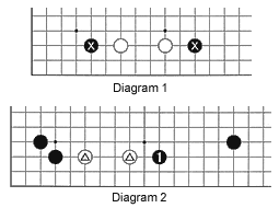 Diagram 1: The white stones have a base, but how strong is it when bracketed by the marked black stones? And by extension, what would the value then be of either or both of the marked black stones?