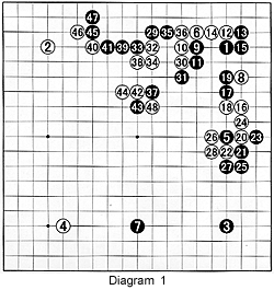 Diagram 2: Black really should defend in the upper right, because White has closed off his escape path to the center. Exchanging black 1 for white 2 makes black 3 and 5 a natural follow-up--we call this natural flow (sometimes referred to as choshi ga ii). Also note that this indirectly attacks White's group on the right, as we'll see in the next diagram. White 6 is an assertive move--Otake tries to turn the whole lower left corner into territory. Black establishes a position in White's sphere of influence on the left with 7 through 19. Otake regretted white 18 and 20 as moves that seem to connect, but don't make territory, and provoked a black defense at 21. White should have at least played 20 to the left of 19. The reason for the mistake is White was impatient to get sente (initiative) to play at 22, a move easily worth over 20 points. Black 29 is the beginning of White's end. White 30 is not to the point at this stage--he should defend his center group.