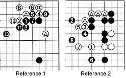 Diagram 1: Black 1, 3 and 5 form the san-ren-sei, or three star points in a row, a strategy Takemiya has employed on and off for more than 30 years. Takemiya is a stylist who does not like to make bad shape, such as empty triangles, but who is perfectly happy to induce bad shape in his opponent (see Reference 1). Hence, the choice of black 13 and 15. Black 17 is a good nozoki (peeking between two stones) and White is in a bit of trouble. Since almost everything is sente against the top white group, he needs to ensure life quickly with stones 8, 16 and 18 (see Reference 2). White 20 and 22 form a tesuji for making sabaki (light shape with potential for eyes). Takemiya immediately played 23 in anticipation of 24, which makes another empty triangle--white 18, 16 and 24. During the analysis, Takemiya offered Reference 3 as an alternative for White.