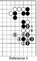 Reference 3: (Note: After the marked stone is taken with black 5, black 7 would be played at this spot.) The combination white 2, 4 and 6 make sabaki. By sacrificing the marked stone, White's stones tesuji, thus making good shape, and Black's stones are on the inside while White's stones are on the outside. Takemiya liked this because White can make a good shape, while Black's shape is poor. However, Black can always play later at 9, and White would be unable to play at A, because Black would cut at B. In other words, White gets no territory, but he gives a lot to Black. So, theoretically, it is a good choice, but actually White loses too much territory.