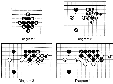 On the other hand, the black stones at A, B and 25 are all parts of an imperfect ponnuki, as illustrated in Diagram 1--they make Black's shape inefficient in terms of territorial value. The black territory on the upper side is not very large, while the white wall is thick and has great attack potential.