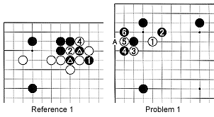 Solution 1B: To avoid the result seen in Solution 1A, Black will usually connect at 2. However, this allows White to make an atari at 3 to get more use out of white A. After black 4, white 5 is a good, light move. Take a good look at this result--the stone at 2 and the marked black stone are not striking models of efficiency. On the other hand, Black has secured his upper left corner and the upper area, while White's stones are still a little weak. The exchange shown here is a middle game joseki that works out roughly even for both sides.