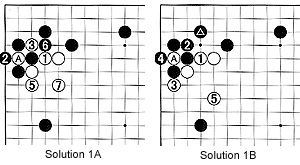 Solution 1A: White 1 is a good move. Black 2 initially makes a perfect ponnuki, but white 3 is good. Black can't afford a ko, which risks all of his territory. So connecting at A is the wise thing to do. White 5 then threatens to activate white 3. To prevent this, black 6 is nearly unavoidable, giving White the opportunity to make good shape with 7. This is a good result for White.