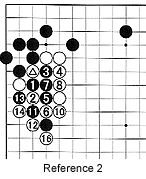 Reference 2: (Black 9 will be played where the marked white stone is, and black 15 connects at 2.) If Black cuts at 1, white 2 is a good response. Black can capture with 3, but white 4 confines Black. If Black tries to break out with 5, or makes a similar move, he only gets himself deeper into trouble. After white 8, Black has to connect with 9 where the marked white stone is. After white 10, Black can cut and capture again with 11 and 13, but in the sequence to 16, White lays waste to most of Black's territory. White has succeeded in giving Black a lot of imperfect ponnuki shapes, while his wall is flawless.