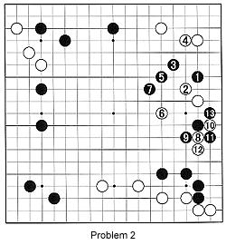 Problem 2: This is the third game of the 1971 Honinbo match. Black is played by Rin Kaiho and white by Yoshio Ishida. The problem starts when Black invades at 1. White must prevent Black from connecting, which he does with 2. In addition, he must prevent Black from invading the upper right corner, which he does with 4. Black 5 makes good shape, which is matched by white 6. After black 7, white 8 and 10 form a great sabaki (clever combination to make a light shape with the potential for eyes). Black decides to capture white 10 by playing 11 and 13. How should White respond?