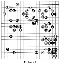 Problem 3: This is a game played by Go Seigen (white) and Akira Hasegawa, in 1949. The moves 34 and 36 are an abrupt intrusion into Black's territory on the right side. Black fights back by taking away part of White's lower right corner. White 46 is a great move, although it leaves behind weaknesses. Later on, a fight breaks out in the center and Black, trying to exploit the weakness in White's shape, sets up a ko with 57. Why? Why not use the move at black 55 to connect 27 and 7? Before you attempt to answer, think about today's theme--spoiling shapes and inducing imperfect ponnuki shapes. What is Black's other aim?