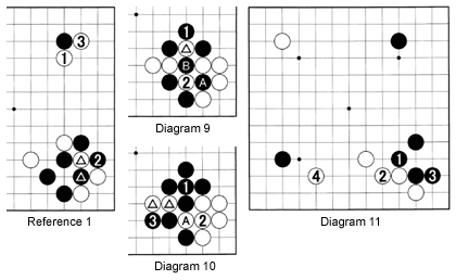 Diagram 1: This is a ko situation. If it is White's turn, he can fill in his ponnuki at A to connect and save the marked stone. However, if it is Black's turn, he can capture the marked stone.