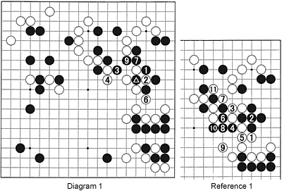 Reference 1: If Black connects after white 1 (6 in Diagram 1), White also will connect. Moves 4 through 11 show one possible continuation. The result is that Black's three stones at the top will be captured, while Black cannot capture the white group consisting of white 1, 5, 9, etc.