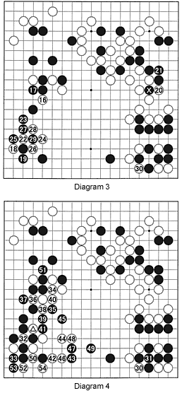 3. Kikashi (forcing moves)--the moves 22 through 28 (Diagrams 3 and 4) are an example. Black has to defend his territory with 27 and 33.