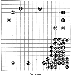 Diagram 5: The fight immediately starts when White invades with 14. The moves through 24 seem natural, but black 25 appears unyielding. However, White's cuts of 30 and 32 seem crude and in the sequence to 38, he ends up having played two stones (24 and 30) unnecessarily. Black 39 is a difficult move to assess. Full of fighting spirit, White immediately extends with 40 and 42. Black 43 stops this movement, leaving White with no choice but to go either up or down. White chooses to go down with 44, and black 45 starts a semeai (capturing race between two groups). Who will win this race? There is an interesting ko that White can start. Can you see how it would work?
