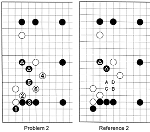 Problem 2: This is a follow-up to Solution 1. After black 3, white 4 seems a good move. Black 5 now looks natural, but after white 6, Black is completely hemmed in. Something went wrong somewhere. But when and where?