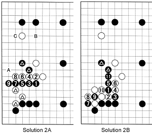 Solution 2A: Stay flexible! Black has to move just beyond the line between White's surrounding groups. This is a recurring theme in go. Other descriptions that fit the bill are "stick your head out," "move beyond your opponent" and "stay ahead." That is the reason Black should play at 1. If White tries to cut with 2, Black plays at 3. White can cut off the marked stones to 8, but in exchange, Black engulfs the marked white stones. After black 9, the marked white stones are dead, but the marked black stones still have some life in them. Black can still connect underneath with A, and even if White prevents that, Black can sacrifice his marked stones with B and/or C. In short, this is a profitable trade for Black.