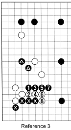 Reference 3: Black C in Reference 2 is also good. But only if you are willing to block at 4 after white 4. If Black yields and allows White to drive between his positions as shown in the sequence to 6, Black sets himself up for failure. After white 8, his cross-marked stones are in trouble. Even if they don't die, they will cause damage to stones nearby.