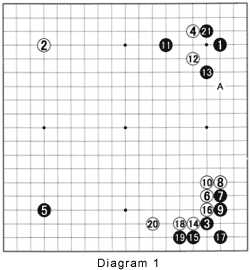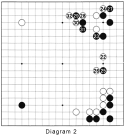 Diagram 2: White can't save his stones in the upper right, so he sets out on a strategy to sacrifice them in the most advantageous way possible. First he limits the damage by playing 22. Note this is also an extension from his thickness below (see Reference 1).