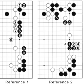 Reference 2: The upper right corner represents the final result in this area. The marked stones give Black's position enormous outward strength. If Black were to invade at 1 next, White would surely forgo a frontal clash with a move at A. Instead, White should be happy to connect underneath with the combination to 6, even though his position becomes low.