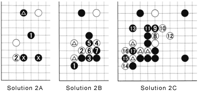 Solution 2A: You were asked what Black should do in response to white 2. Obviously, White is aiming at cutting either through the triangle-marked stone and black 1 or through black 1 and the stones marked with crosses.