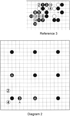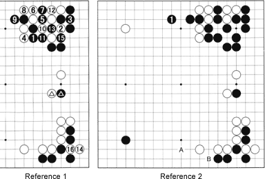 Reference 3: The moves from 2 through 10 are a tesuji combination, but so are the moves black 5 through 9. The result is decided by the ladder Black starts with 7, 9 and 11. In the game, the ladder is bad for White, meaning White cannot play the combination 2 and 4. Instead, he could have played a ladder block at A in Diagram 1. Black will have to answer in the upper right corner, giving White an extra move to make a double approach at B. The result is reasonable for both players.