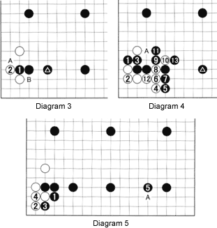 Diagram 3: With the marked stone in place, Black should definitely play at 1. White 2 will almost certainly follow. At this point, Black has two choices, A and B. In general, Black should choose A, but if the lower side (below the marked stone) is considered important, it might be better to play at B. Try to envisage the follow-up for both sides.