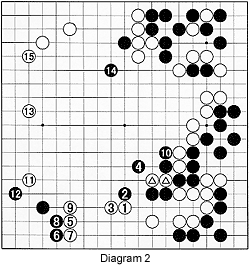Problem 1: Look at Diagram 2. Why did Black add a move at 10? Before black 10, could the white stones have escaped? Instead of 10, where should Black have played?