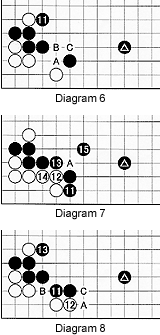 Diagram 6: Black 11 is a steady move, although the cut of white A, followed by black B and white C remains. However, with the marked stone in place, there is no reason for Black to panic after that cut.