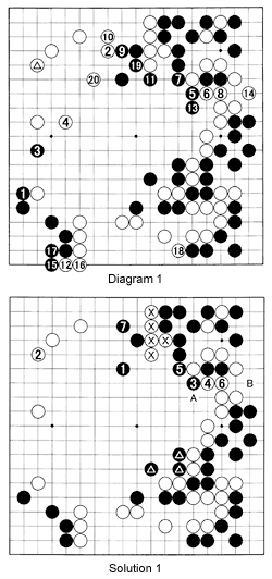 Solution 1: The question last week was how Black should continue after White ignored black 1 by playing at 2. Black should have exchanged 3 and 5 for 4 and 6, then played at 7 to cut off White's marked stones. As Black can exchange A for white B, the marked stones may die, but even if they don't, the thickness Black has built with the marked stones will come in handy during the battle to come.