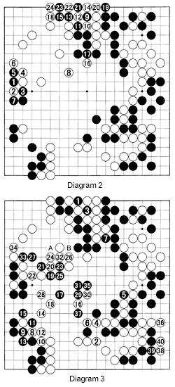 In go, it is easier to create new groups than to give them away. This is probably due, in part, to the mental attachment players form with their groups. In defending his Meijin title in the fifth game of a best-of-seven match with Cho Chikun, however, Yoda (White) keeps giving away stones and groups. In Diagram 3, he gives away as many as 10 stones without hesitation.