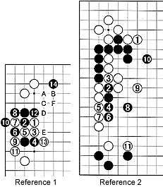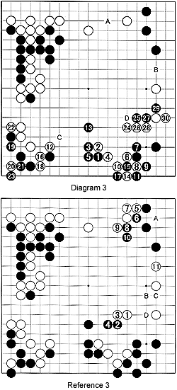 Reference 2: Instead of 17 in Diagram 2, White should have extended to 1. Black would cut with 2 and escape with the sequence to 8, but after 9 and 11, White need not worry--he can put up a good fight here.
