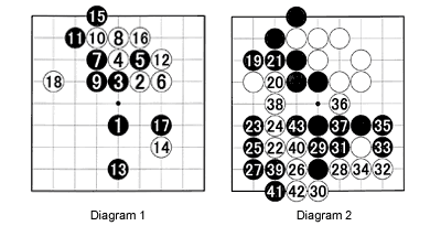 Diagram 2: Black naturally resists with 19 and 21. White 22 looks like it may make life in the corner, but Black answers perfectly with 23 through 27. White 28 and 30 are a hopeless final attempt. Instead of 32, White could have been more aggressive by extending to 33. This might have proven more tenacious (see Reference 5). After white 38, Black forces with 39 and 41, then finishes off White's group by connecting at 43. White resigns.