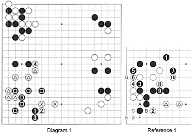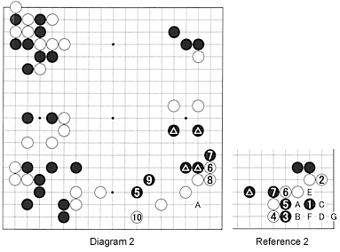 Reference 1: Many people probably would want to attack and play at 1, which makes some territory for Black. However, that would allow White to take the key point at 2. Black can now attack with 3 through 7, but after the exchange white 8 for black 9, White may counter with 10. This means that Black would come under attack, as White's position at the bottom (marked stones) is now strong. In the worst case, White can always play at A, followed by black B, white C, black D, white E, black F and white G, to ensure life.