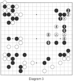 Diagram 3: As shown in Diagram 2, Black is strong on the right side. To fully use that power, attacking with black 1 is best. This deprives White of a potential base here, while scoring a lot of points by capturing the white stone marked with a cross in the sequence to 7. White has to take flight with the two stones marked with triangles so he has to play 8. Black 9 was a problem move.