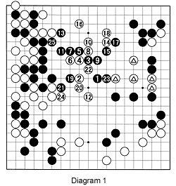 Diagram 1: Upon seeing 1, it was immediately clear to O that he was in trouble. Since he could not afford to just defend his marked stones, he did what he does best: he caused confusion. White counterattacked Black's stones on the left by playing at 2. However, Yamashita didn't panic and steadily kept up the attack with 3, 5 and 7. The sequence that follows is difficult to understand, but the result is that Black's group is alive when he plays at 25--stage one of this fight. The second stage is what happens to the marked white stones. What do you think? Will White be able to keep them alive?