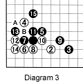 Diagram 3: In answer to 2 and 4, black 3 and 5 are another possibility. White will invade at 6. Black should block at 7 and, after white 8, play at 9 to connect all of his stones (see Reference 1). After white 10, black 11 is another important move (see Reference 2). The same is true for black 15--connecting at B would only give Black bad shape. White A would not amount to more than an endgame move, and Black would switch to or in the neighborhood of C.