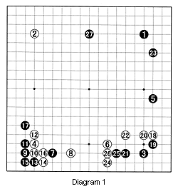 Diagram 1: O plays 1, 3 and 5, the so-called low Chinese fuseki, an aggressive opening strategy. White 6 is a modern approach to deal with this opening. Black 7 invites white 8. O then plays at 9 to enter the corner and take territory in a standard sequence to 17. White 18 next isolates black's stone at 3, which Black has to defend with 19 and 21. The combination of white 22 and 24 is a little slow, which is illustrated by black 25, which has to be answered with 26, giving Black the opportunity to seize the initiative at the top. At this point, Black is already doing well. Where should White play next?