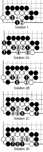 Problem 1: White to play first and make life. Because of the limited number of possibilities for the first move--only four in total because of the symmetry--this is not a difficult problem. However, even for fairly strong players this problem holds a blind spot.