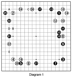 Diagram 1: The moves through 17, with slight variations, have been seen before in games we have discussed. Instead of 18, White can also start a fight by playing at 19. The exchange to 20 is quiet. Separating the left side, black 21 is important to establish a base in this area. White 26 is a good move. Many amateurs would immediately answer at A, as this is a joseki (standard corner exchange). This would force Black to defend at B. Theoretically, this would allow White to extend on the lower edge. However, a black move at C next would be severe. Because Black's top left group would be strengthened, he would be able to invade around E. To avoid these backlashes, White chose 26 to keep the possibility for an invasion at D open, while at the same time putting pressure on the black group in the top right corner. The drawback is Black's advancement to 27. All the big points have been played now. Where should White play next? List a few possible moves, and then look at the pros and cons of each.