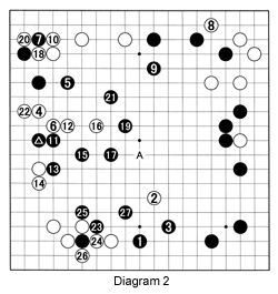 Therefore, White chooses to counterattack with 18. What is the aim of this move? Refer to Reference 1. Surprise, surprise, Black totally ignores White's threat and occupies the key point of 19. White has little choice but to follow up on his threat with 20. Again, Black ignores him and strengthens the center even more with 21, forcing white 22 to establish a makeshift connection. Black 23 through 27 complete Black's center moyo.