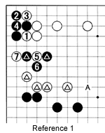 Reference 1: In response to white 1 (white 18 in Diagram 2), Black would usually answer at 2. The exchange white 3 for black 4 would follow, but next white 5 is severe, threatening to split the marked black stones. Black has no good answer to this move. If he plays at 6, white 7 cuts the marked stones from the black corner group. If Black has no good response to white 5, it means the marked white stones are strong, making a white jump to A unnecessary. That is the meaning of white 1.