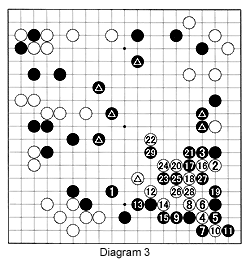 Diagram 3: Black 1 (27 in Diagram 2) completes Black's moyo. White has to save the marked stone to make a game of it. In a case like this, the best strategy is usually to play against enemy stones at various places, hope weaknesses appear and play a move that has to be answered. That is what White does with 2 through 20. Then he makes the appearance of eye-shape with 22. Black first quietly grabs the tail with 23 through 27, and then plays rough with 29. This move may seem to have the subtlety of a woodsman swinging an ax, but it is backed up by punctilious reading, making use of the acute shortage of liberties White has with 20 and 24. White is dead and the game is over. White starts another fight in the center, but thanks to Black's overwhelming strength there--in particular the marked black stones--Lee Se Dol wins the game by resignation.