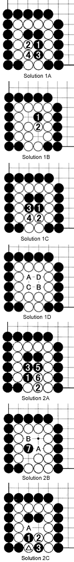 Solution 1A: Black shouldn't play 1, but if he does, white 2 is the right answer. Even if Black plays 3, white 4 captures four black stones, making a life shape. See Solution 1B.