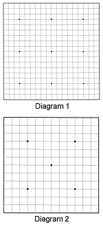 Diagram 1: This is a full-size board constituting of 19 horizontal and 19 vertical lines, forming 361 intersections. Nine of the intersections are emphasized (also on an actual board) to indicate handicap points, used when there is a difference in strength between the two players. Strategy and tactics match each other in importance.