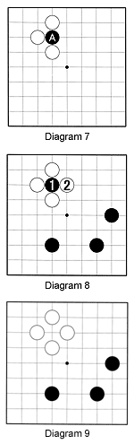 Diagram 7: The black stone at A is almost surrounded by white stones. It has only one liberty left. If all liberties are taken away, a stone is captured and taken off the board.