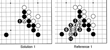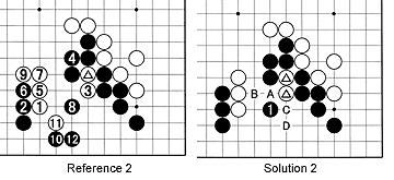 Reference 2: How did we get to the position in Solution 2 from Solution 1? White played at 1 to wreck the ladder in Reference 1. However, Black did not capture the marked stone immediately. He first played at 2. At that moment, White grabbed his chance and pulled out with 3 forcing Black to connect at 4. After white 7, Black needed to bottle up the two white stones with 8. After white 9, black 10 and 12 established a connection underneath.