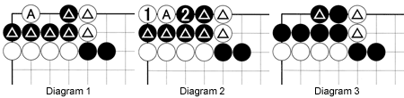 Diagram 3: This is what the situation now looks like. The marked black stone is the last move played by Black.