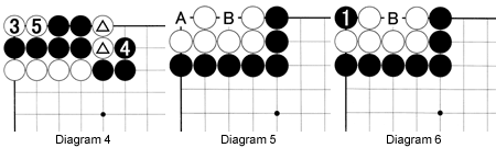 Diagram 5: This is an interesting position. White's stones are surrounded so it looks as they have a problem. In fact, they have only two liberties left. However, can Black capture them? There are only two possibilities at A and at B. What happens if Black plays at A?