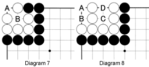 Diagram 8: This white group is alive too. Black can play at A or B, and at C or D, but he cannot play at both A and B or at C and D. In other words, Black can never take away White's last liberty and capture the stones.