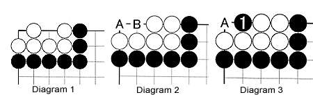 Diagram 3: The reason that Black can play at either A or B is that if he plays at 1, he still has a liberty left at A. True, White can capture the black stone by playing at A, but then White would have only one liberty left--where he captured black 1. If White doesn't capture the black stone, he only has one liberty left anyway--at A--and Black can capture the lot by occupying that last liberty.